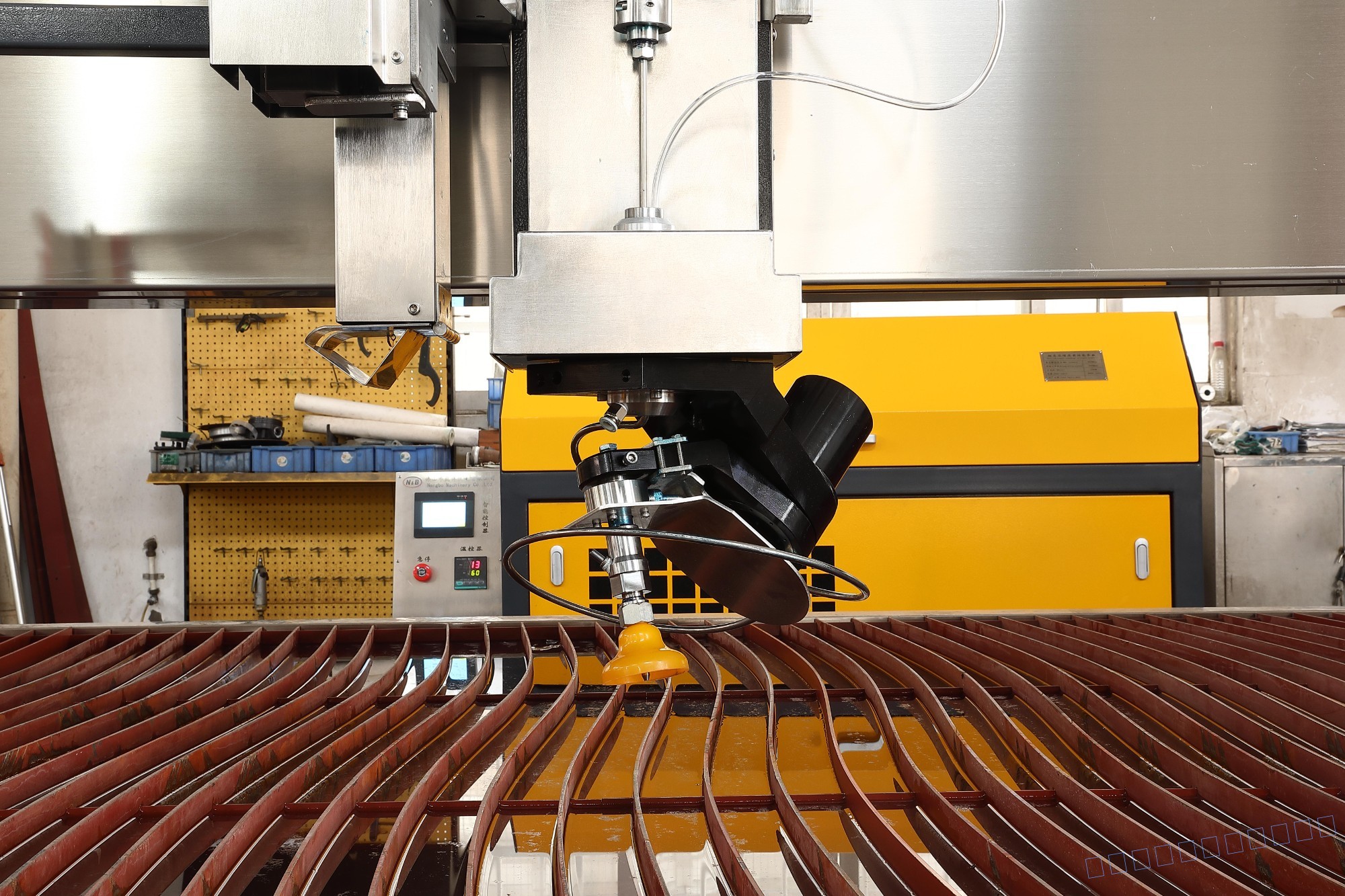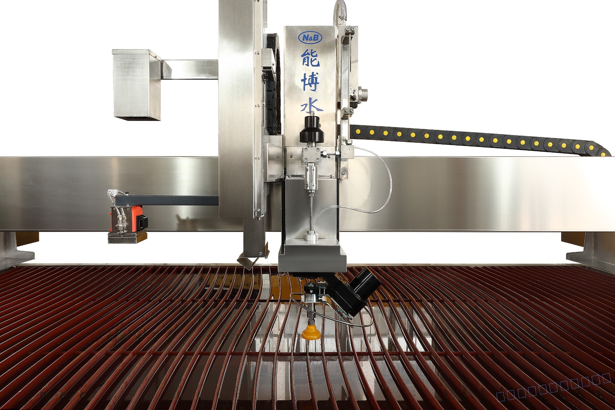 能博水刀龍門式AC軸五軸水刀能博2019款水切割平臺全新設計,更出色的平臺防塵效果,更穩定的重心結構,全新配色方案。機臺適合切割巖板,3020型號切割尺寸范圍:3000*2000mm,AC五軸刀頭:無限旋轉,激光測高自動吹干水,可曲面自動切割,切割斷面角度±75?